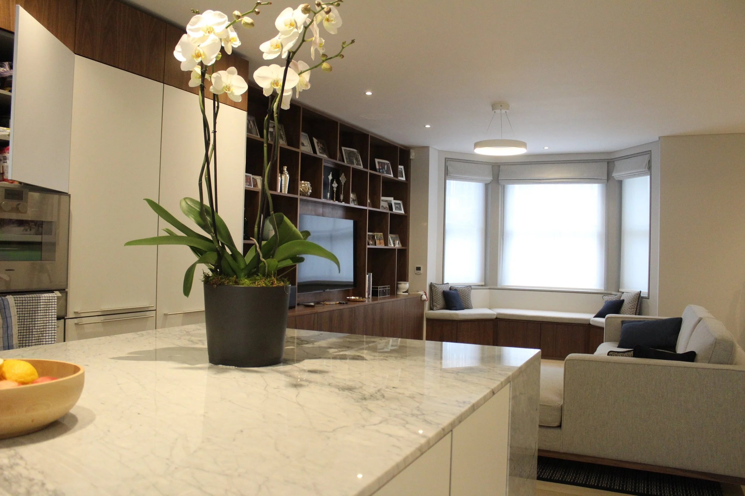 The home was then finished with luxurious touches: leather detailing, a crittall entranceway and book-matched marble worktops that all helped to create an exciting and inviting space. And the piece de resistance: a full wall media unit made to measure to house the client’s possessions. We also created a seamless indoor-outdoor flow so that the family could enjoy their private gardens.